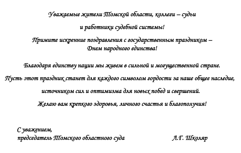 ПОЗДРАВЛЕНИЕ ПРЕДСЕДАТЕЛЯ ТОМСКОГО ОБЛАСТНОГО СУДА Л.Г. ШКОЛЯР С ДНЕМ НАРОДНОГО ЕДИНСТВА
