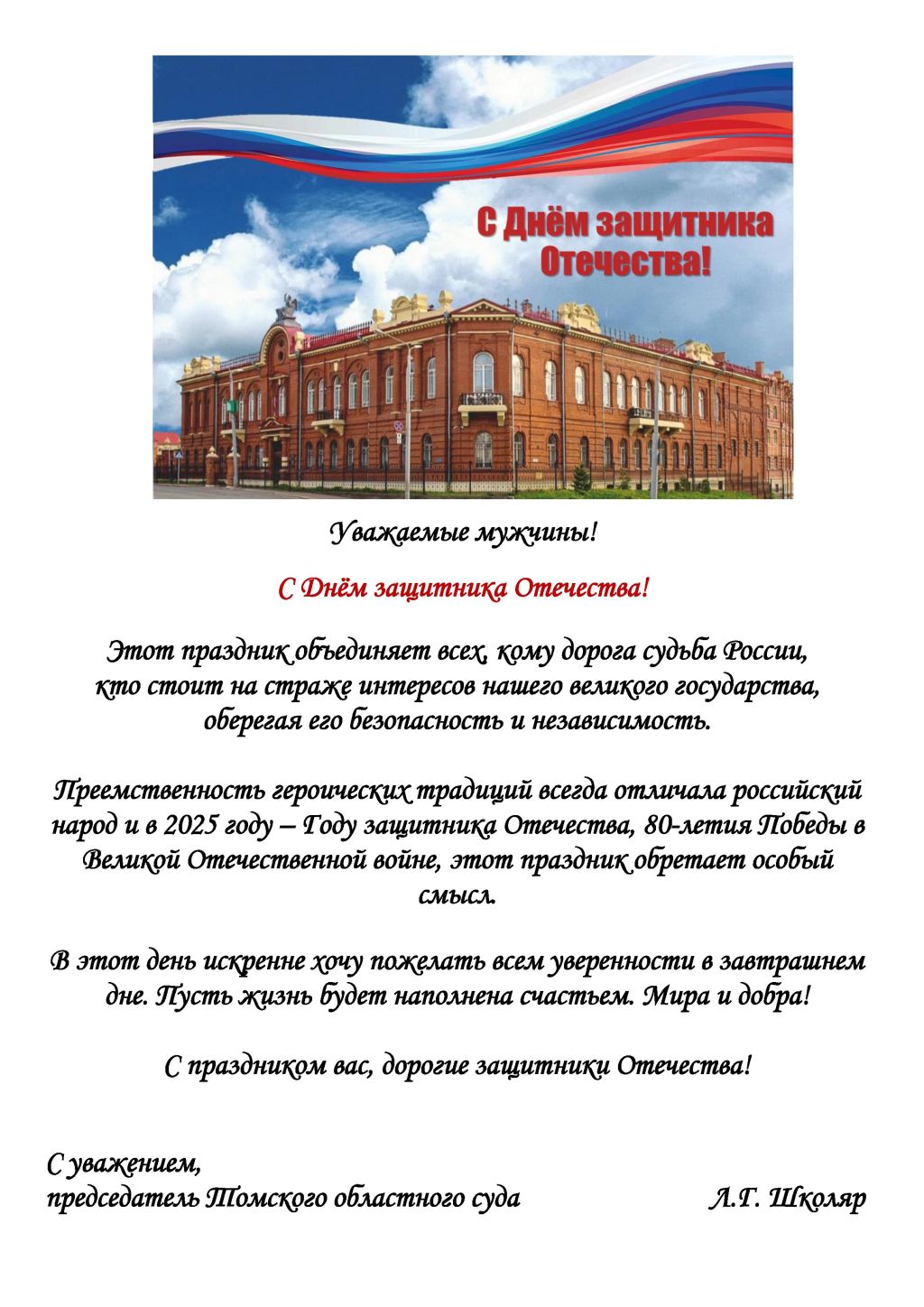 ПОЗДРАВЛЕНИЕ ПРЕДСЕДАТЕЛЯ ТОМСКОГО ОБЛАСТНОГО СУДА Л.Г. ШКОЛЯР С ДНЕМ ЗАЩИТНИКА ОТЕЧЕСТВА