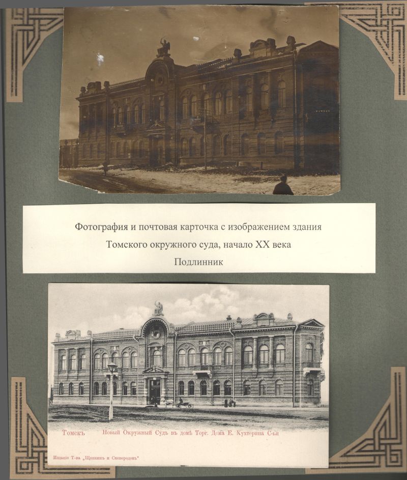 Подлинники фотографии и почтовой карточки с изображением здания Томского окружного суда XXвека